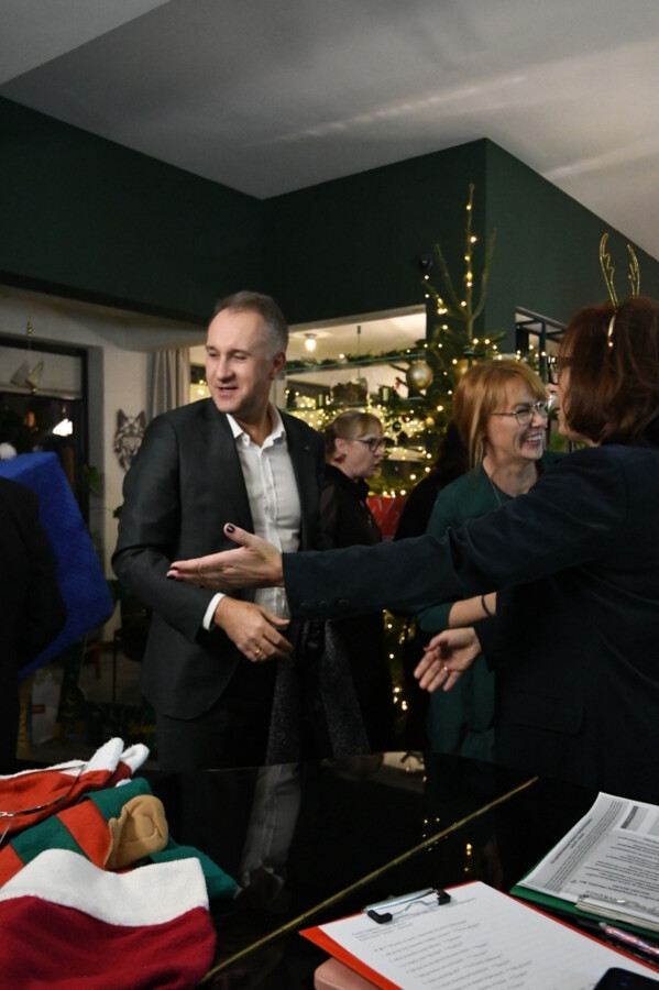 Nie zabrakło również elementów integracyjnych. Losowanie świątecznych upominków, które poprowadziła pełna uroku Pani Prezent, wywołało wiele radości i uśmiechów. Wieczór zwieńczyło wspólne kolędowanie, które stworzyło ciepłą, rodzinną atmosferę i stało się pięknym zakończeniem spotkania.