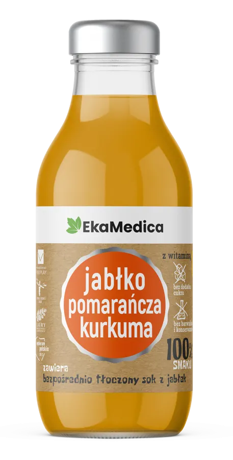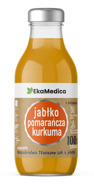 Suplement diety wyprodukowany z soku jabłkowego bezpośrednio tłoczonego - NFC, soku pomarańczowego i soku z kłączy kurkumy, z dodatkiem witaminy C. Pasteryzowany.