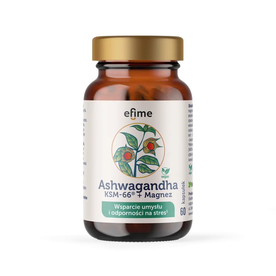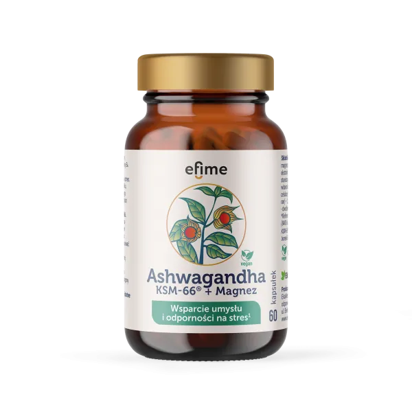 Ashwagandha - suplement diety w kapsułkach zawierający ekstrakt z korzenia witanii ospałej – ashwagandha, witaminę B6 oraz magnez. Ekstrakt z witanii ospałej - ashwagandha posiada właściwości adaptogenne.