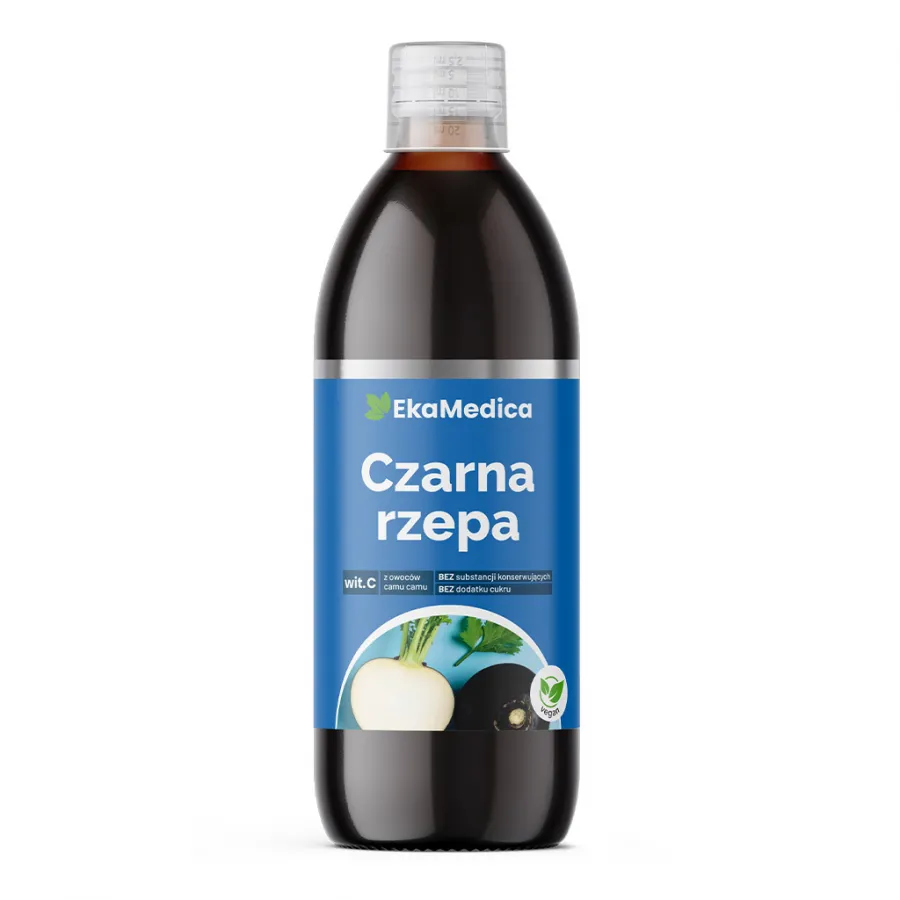 Czarna rzepa - suplement diety w formie płynnej, wyprodukowany z ekstraktu z czarnej rzepy z dodatkiem naturalnej witaminy C pochodzącej z ekstraktu z owoców camu-camu. Pasteryzowany.