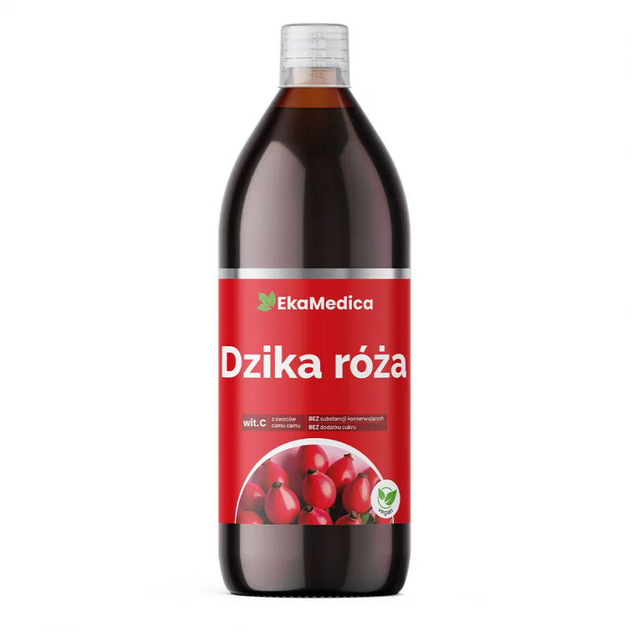 Dzika róża - suplement diety w formie płynnej, wyprodukowany z soku 100 % z owoców dzikiej róży z dodatkiem naturalnej witaminy C pochodzącej z ekstraktu z owoców camu camu. Pasteryzowany.