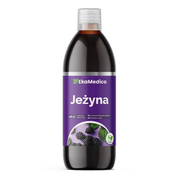 Jeżyna - suplement diety w formie płynnej, wyprodukowany z puree 100% z owoców jeżyny z dodatkiem naturalnej witaminy C pochodzącej z ekstraktu z owoców camu camu. Pasteryzowany.
