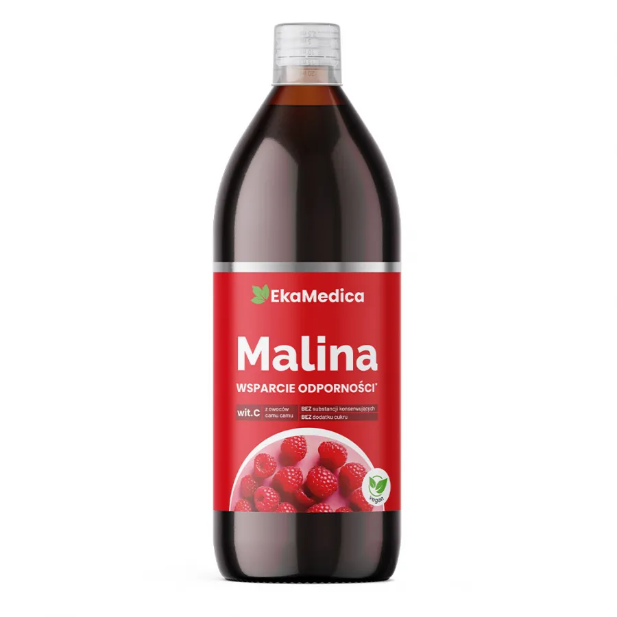Malina EkaMedica. Wsparcie odporności. - suplement diety w formie płynnej, wyprodukowany z soku 100% z owoców malin z dodatkiem witaminy C naturalnego pochodzenia, pochodzącej z ekstraktu z owoców camu camu. Pasteryzowany. *Witamina C wspiera układ odpornościowy