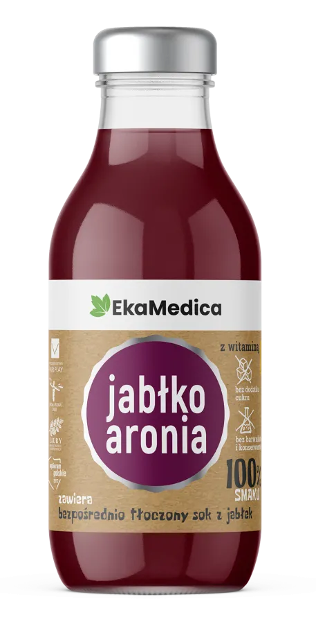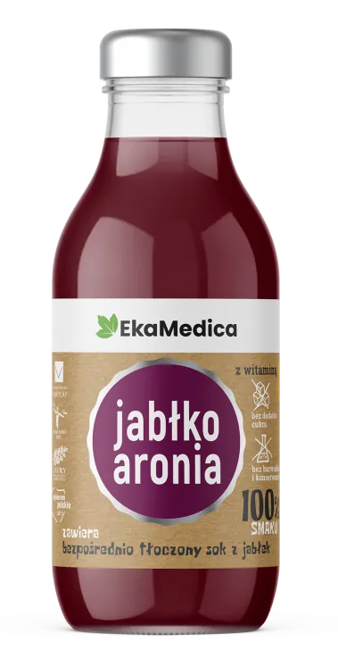 Sok jabłkowy bezpośrednio tłoczony z sokiem z owoców aronii, wzbogacony witaminą C. Wyprodukowany częściowo z soku zagęszczonego. Naturalnie mętny. Pasteryzowany. Suplement diety.