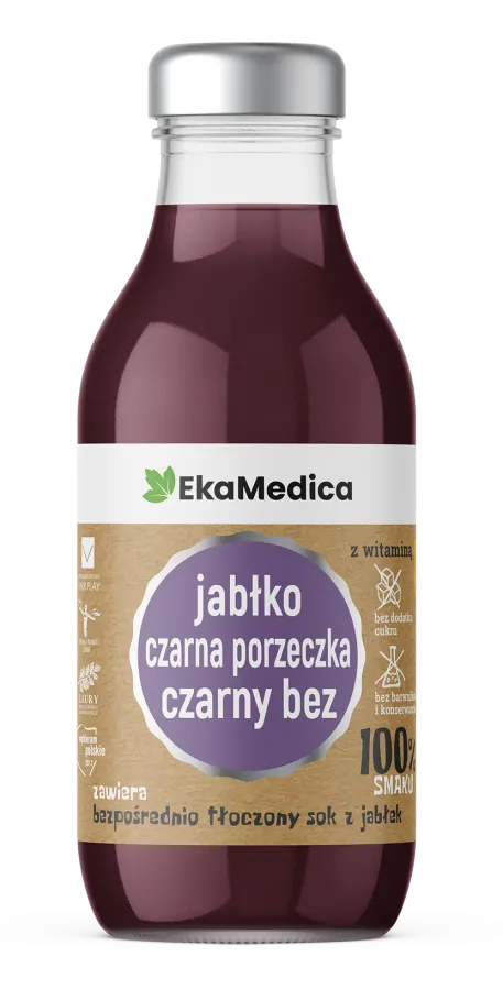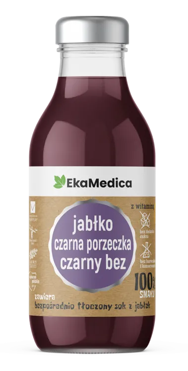 Suplement diety wyprodukowany z soku jabłkowego bezpośrednio tłoczonego z dodatkiem soku z owoców czarnej porzeczki i czarnego bzu, wzbogacony witaminą C. Pasteryzowany.
