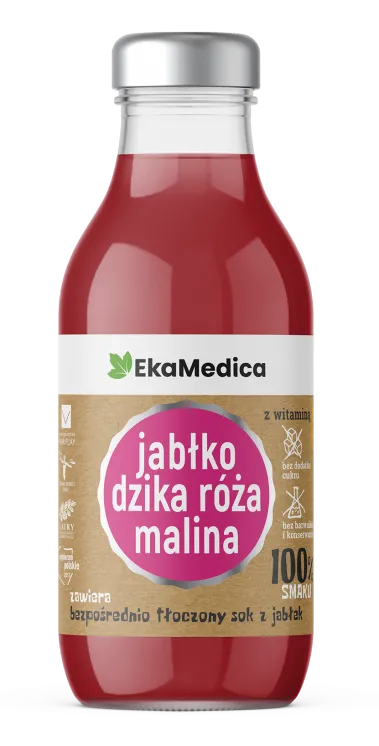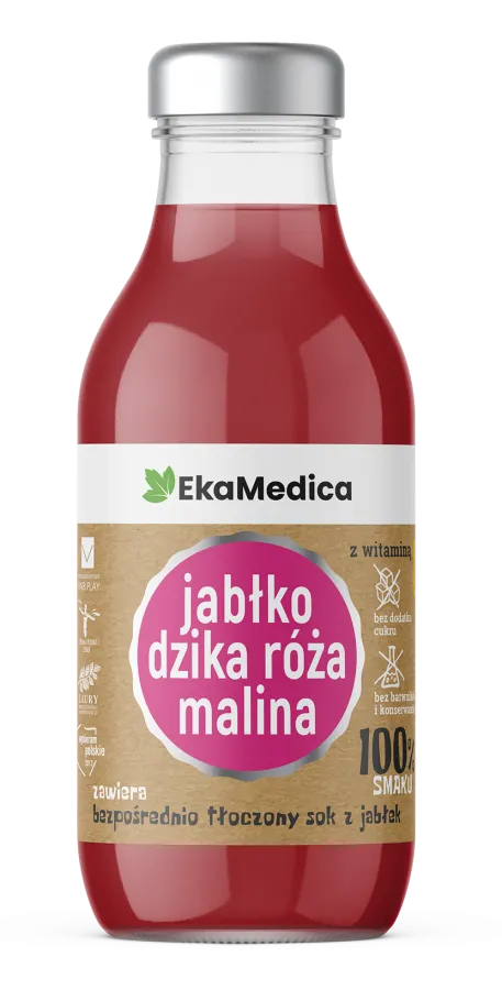 Suplement diety wyprodukowany z soku jabłkowy bezpośrednio tłoczonego z dodatkiem soku z owoców dzikiej róży i maliny, wzbogacony witaminą C. Wyprodukowany częściowo z soków zagęszczonych. Naturalnie mętny. Pasteryzowany.