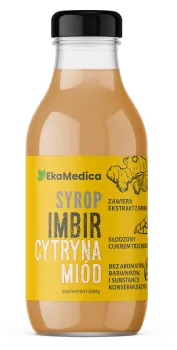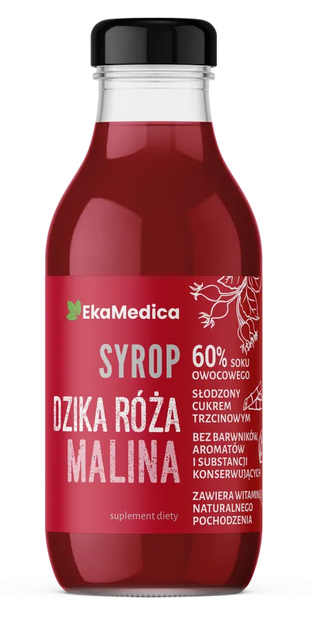 Syrop z owoców malin i dzikiej róży zawierający naturalną witaminę C pochodzącą z ekstraktu z owoców aceroli – suplement diety. Pasteryzowany.