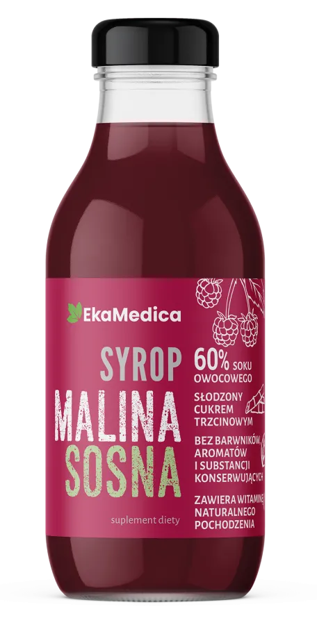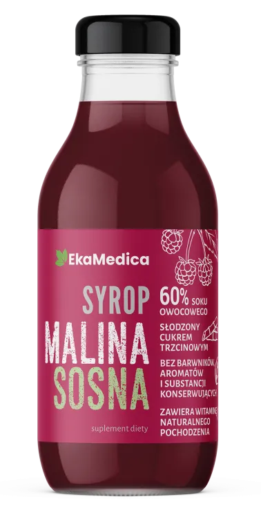 Syrop z owoców malin z wyciągiem z pędów sosny zawierający naturalną witaminę C pochodzącą z ekstraktu z owoców aceroli – suplement diety. Pasteryzowany.