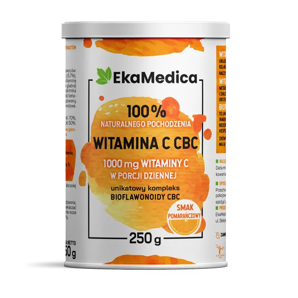 Naturalna Witamina C CBC od EkaMedica z kompleksem CBC jest o smaku pomarańczowym. Dodatkowo w opakowaniu znajduje się miarka, w postaci łyżeczki ułatwiająca precyzyjne dozowanie produktu.
